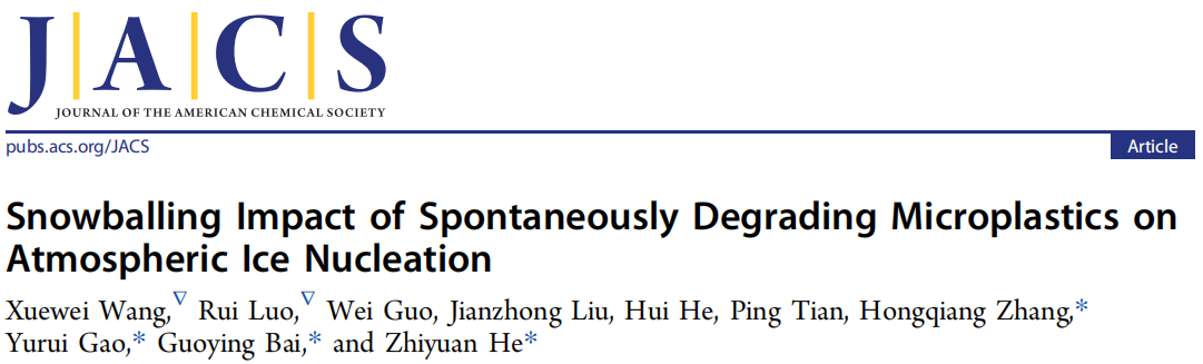 X. Wang, R. Luo, W. Guo, J. Liu, H. He, P. Tian, H. Zhang, Y. Gao, G. Bai, Z. He, Snowballing Impact of Spontaneously Degrading Microplastics on Atmospheric Ice Nucleation. J. Am. Chem. Soc. 2025. https://doi.org/10.1021/jacs.5c10269.