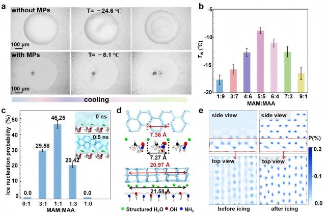 要点二:利用微流控合成了粒径形貌一致但官能团比例不同的 P(MAM-MAA) MPs。实验与分子动力学模拟一致指出:当MAM:MAA = 5:5时,表面–OH/–NH₂ 与–CH₂的交替排布会有序化界面水层,其二维周期与六方冰棱柱面晶格常数实现近似匹配,从而显著提升成核概率。