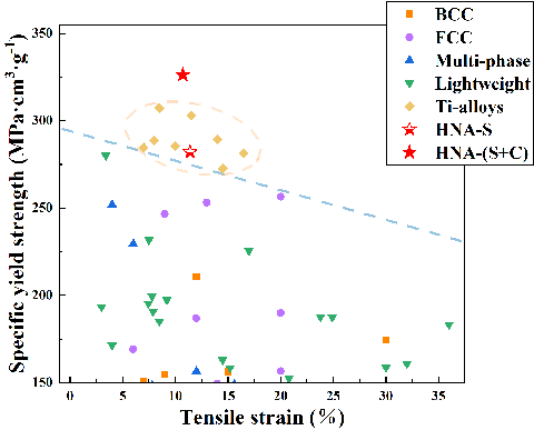 本工作合金(HNA-S+C)展现出优异的比屈服强度—塑性匹配
