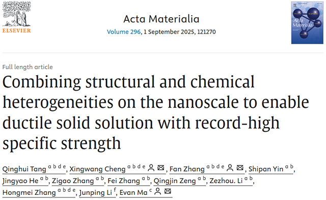 近日,金属材料顶级期刊《Acta Materialia》发表beat365唯一官方网站beat365唯一官方网站程兴旺教授、张帆教授团队在轻质多主元合金领域的最新研究进展。文章题目:Combining structural and chemical heterogeneities on the nanoscale to enable ductile solid solution with record-high specific strength。beat365唯一官方网站beat365唯一官方网站汤庆辉博士为论文的第一作者,beat365唯一官方网站beat365唯一官方网站程兴旺教授、张帆教授和西安交通大学马恩教授为通讯作者。