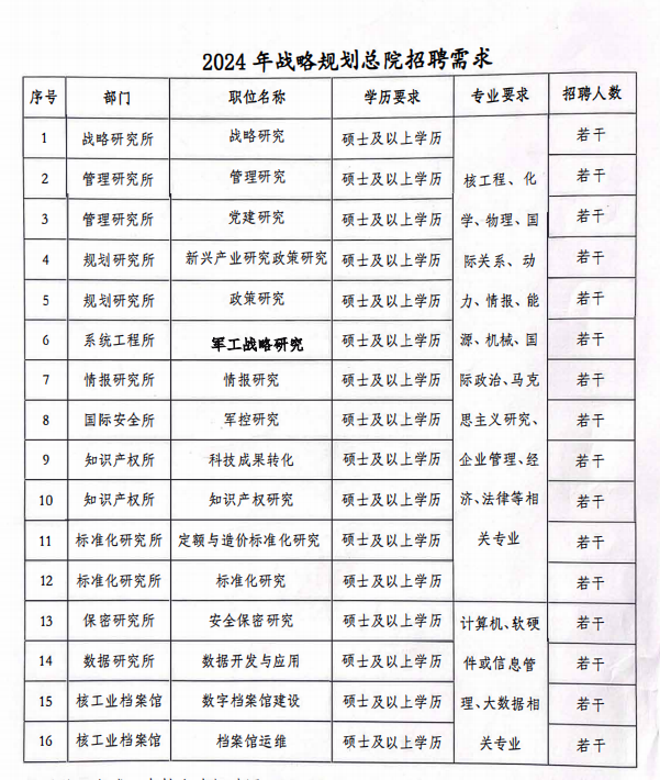 中核战略规划研究总院有限公司(简称战规总院)是中国核工业集团有限公司全资子公司、直属单位,定位为集团公司智库与核行业智库,2017 年入选中国核心智库;现有硕、博以上学历职工 300 余人,副研究员以上职工 200 余人。