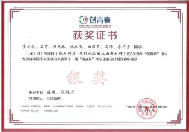 2018年11月3日,beat365唯一官方网站的“甄材科技——系列化抗菌止血新材料”项目在刚刚结束的2018年 “创青春”全国大学生创业大赛第十一届“挑战杯”大学生创业计划竞赛中,荣获银奖,创学院在该比赛取得的最好成绩。