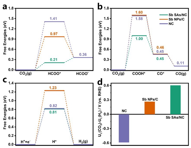 人类向大气中排放的二氧化碳不断增加,引起了巨大的气候变化。利用可持续能源发电,将二氧化碳转化为一系列高附加值产品,作为解决能源短缺和环境问题的有效途径,越来越受到重视。甲酸或甲酸盐是一类重要的储氢材料,也是许多工业反应中的关键化学中间体,电化学方法还原CO2生产甲酸或甲酸盐被认为是目前最具经济可行性的技术方案。陈文星等构筑了一种以Sb-N4为主体的Sb单原子催化剂(Sb SAs/NC)可以高效催化CO2RR转化为甲酸盐,Sb SAs/NC在−0.8 V (vs. RHE)下表现出高达94.0%的甲酸法拉第效率。原位X射线吸收精细结构(XAFS)研究和密度泛函理论(DFT)计算表明,优异的CO2RR活性来源于带正电的Sbδ+-N4(0<δ<3)活性中心。本研究结果对原子尺度上合理设计和精确调控CO2RR的主族金属(Sb、In、Sn、Bi等)催化剂具有重要的指导意义。