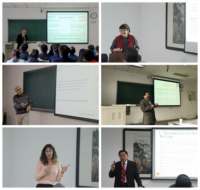 法国里尔大学的Bourbigot教授和Jimenez教授、德国弗劳恩霍夫研究院的Döring教授、英国博尔顿大学的Kandola教授、印度乌特卡尔大学的Sahoo教授、美国佐治亚大学的Yang教授、瑞士国家实验室的Gaan教授、西班牙加泰罗尼亚理工大学的Haurie教授、美国纽约州立大学石溪分校的Rafailovich教授、都灵理工大学Giovanni Camino教授和Alberto Frache教授等诸多阻燃领域国际知名教授,举办了系列讲座二十场,从多个角度对新型阻燃剂设计、膨胀阻燃新概念、纳米阻燃新趋势、聚合物阻燃关键技术、阻燃防火评价方法等阻燃领域的重要问题进行了分析探讨,和我校师生开展了热烈深入的讨论交流,对我校阻燃领域今后的研究开拓了新的思路、新的方向。