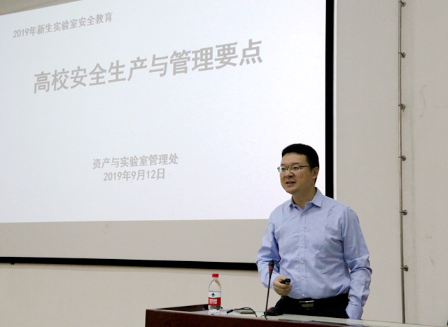 首先,郭宏伟强调了高校实验室安全的重要性,分析了实验室安全的主要内容和工作特点,他以近年来发生在国际、国内以及我校的典型实验室安全事故为例,分析事故原因多是实验操作不当或安全意识不强,治理隐患和预防事故要从“人、机、环、管理”四个方面入手。他强调,同学们一定要加强安全意识和安全文化建设,做好检查与隐患治理,杜绝侥幸心理。