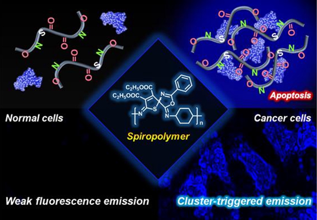 近日,在国家自然科学基金重大项目(批准号:21490574)和面上项目(批准号:21474009和51673024)资助下,beat365唯一官方网站董宇平课题组与韩国高丽大学Kim Jong Seung课题组合作,报道了利用肿瘤细胞中高表达的MDM2蛋白与非传统共轭的螺环聚合物结合,在产生“簇”发光的同时,限制p53与MDM2蛋白结合,从而释放并活化p53蛋白,促进了癌细胞凋亡,实现对肿瘤细胞靶向诊断和治疗的相关工作。
