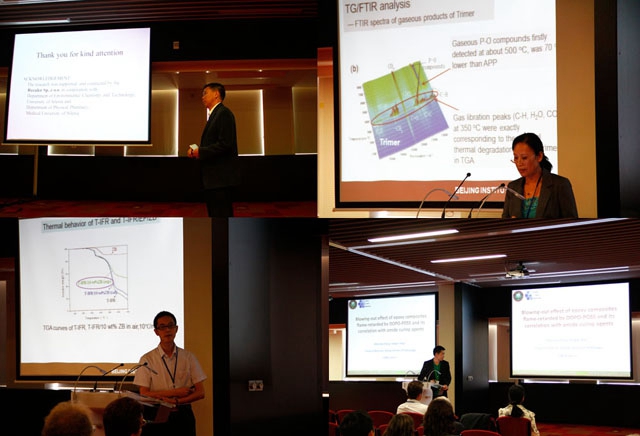 郝建薇教授、张文超博士和周友博士分别在会上作了题为“Study on the thermal degradation of a mixture of a novel caged bicyclic phosphate and ammonium polyphosphate”、“Blowing-out effect of epoxy composites flame-retardant by DOPO-POSS and its correlation with amide curing agents”和“Influence of zinc borate on fire protection and thermal degradation of intumescent coating containing a novel caged bicyclic phosphate”的口头报告,取得了良好的效果,受到与会专家学者的关注,显示了我校阻燃材料学术研究的水平。
