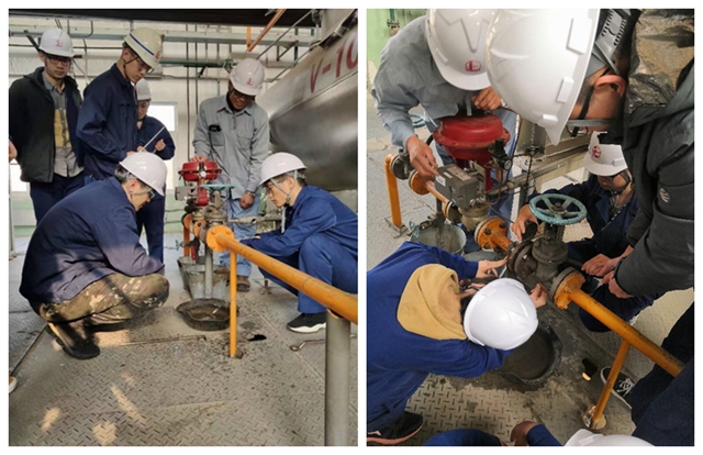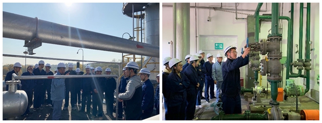 专业实习的重头戏是进入厂房实际操作整套对二甲苯工业生产装置。11月4日,大家首先熟悉了训练装置中压缩泵、反应器加热炉、精馏塔、换热器、离心泵等部件的工作方式与操作规程。随后,同学们分为两组进行实操训练。一组同学在中控室,通过DCS系统控制反应的进料、升温、出料等过程,另一组同学在装置现场,根据中控室指令,操作不同的泵机,并负责加热炉的点火、空冷器的启动等工作,在整个生产过程中还要定时进行室外巡检,以确保每一套装置都正常工作。经过两天的交换练习,每一位同学都对整个工艺流程的各个部分有了全面的了解,掌握了启动、运行、停止整套装置的方法。在最终的考核中,两组同学分别独立地操作了对二甲苯的生产装置,且都成功的完成了开停车工作。