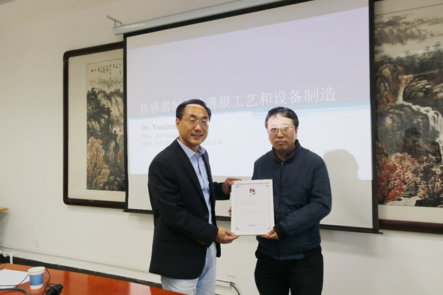 谭成文为唐云俊颁发了北理工“百家大讲堂”纪念证书,“传感器生产的薄膜工艺和设备制造”学术报告圆满结束。