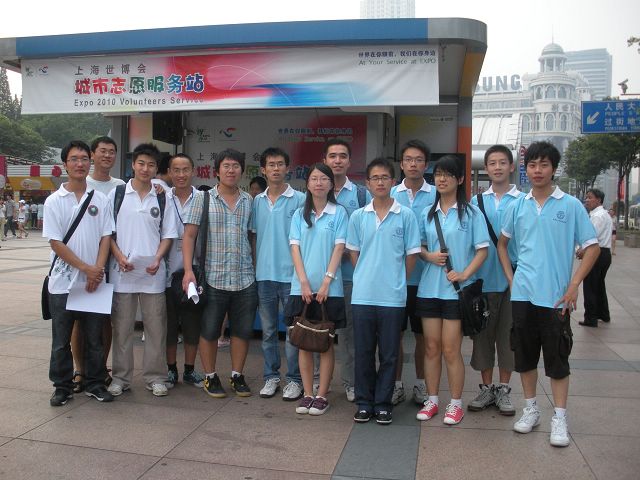 当天下午,实践团成员又来到上海最繁华的人民广场,在地铁出口处的世博志愿者岗亭处与当地志愿者共同交流,并邀请路人参与问卷调查。