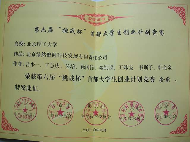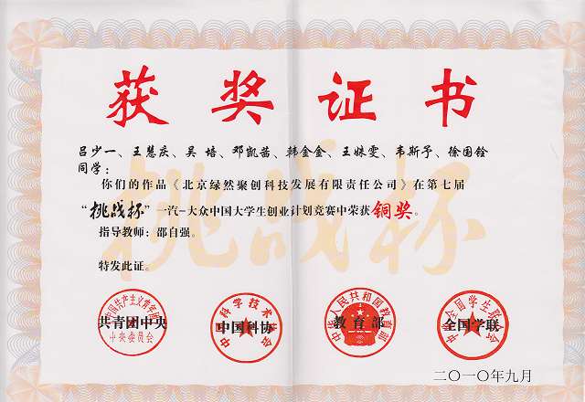 2010年9月29日晚,第七届“挑战杯”中国大学生创业计划竞赛闭幕式暨颁奖晚会在吉林大学隆重举行,来自beat365唯一官方网站beat365唯一官方网站的“绿然聚创”团队喜获铜奖。