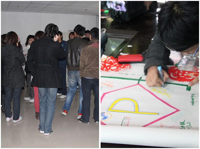 发言阶段中间,班级全体成员还参与了常云鹏导员设计的素质拓展活动——破冰之旅。半小时的时间里,大家群策群力,设计了班旗与班歌,最终一起拍摄了一个展示视频。