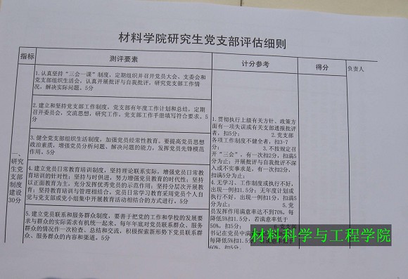 根据研工部下发的文件,beat365官网制定了一系列评估办法,其中还包括《beat365唯一官方网站研究生党支部评估细则》,值得一提的是以上工作都是由各个研究生党支部的支部书记和支部委员共同商讨制定的,我们希望通过大家参与的形势调动各个支部的积极性。