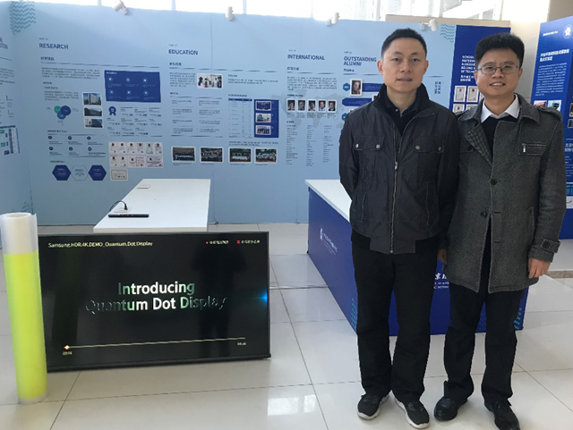 有机发光二极管(OLED),具有超薄、耐低温、快速响应、柔性弯曲等特性,是显示领域的核心技术之一。段炼教授表示,OLED是利用有机半导体材料在电场作用下发光的技术,因此材料是影响OLED性能的重要因素之一。他介绍,热活化延迟荧光(TADF)材料是第三代发光材料,其作为磷光主体,具有材料设计更简单、低驱动电压、效率高、效率滚降小、寿命长等优点,可以制备低电压的磷光OLED。段炼教授也指出,TADF材料三线态激子可通过反向系窜越(RISC)回到单线态并发光,得到内量子效率接近100%的荧光OLED,但高的三线态激子的上转换效率和高的辐射跃迁速率难以同时获得。为了解决上述矛盾,段炼教授提出了热活化敏化发光的新型发光机制,将TADF材料用作主体,掺杂TADF燃料,可以改善载流子平衡,促进能量传递,实现低电压、高效率、低效率滚降、长寿命的OLED器件;同时发展了具有高迁移率的双极性传输材料,突破了电子传输材料高迁移率和高稳定性不可得兼的矛盾。他介绍,通过引入了“敏化”发光机制,利用TADF材料作为主体,掺杂高发光效率的磷光或荧光染料,TADF材料中的单线态激子通过高效的Forster传递将能量传给燃料,并由后者发光。这样,上转换过程和发光过程分别在不同的材料上完成,器件的发光效率取决于TADF材料的三线态上转换效率和染料的发光效率,从而可获得高性能的OLED。讲座结束后,由钟海政教授陪同,段炼教授参观了beat365唯一官方网站纳米光子学实验室,了解了该实验室在量子点显示技术方面的研究进展,特别重点关注了该实验室钙钛矿量子点光学膜技术的产业化进程,并给出了建设性意见。