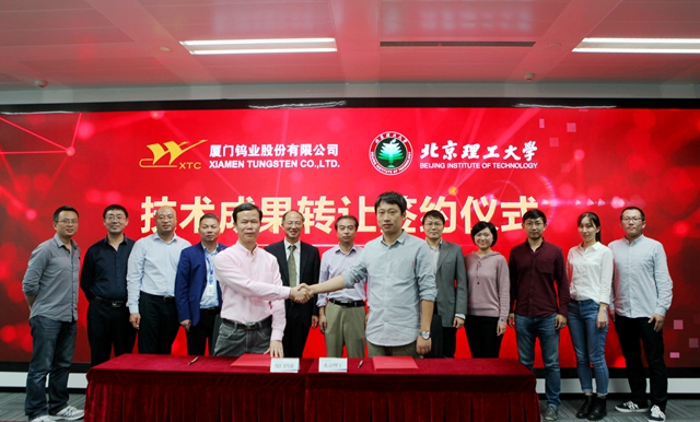 在取得创新成果的基础上,团队、学院及技术转移中心等学校相关部门研究决定,通过产学研结合方式,充分利用企业的生产和市场优势,加速实施成果转化。此前,校企双方经过深入洽谈交流,商定了通过许可方式和“入门费+产值提成”模式,实施该项成果的转化应用,并履行了技术转让的相关审核审批手续。会上,双方代表签订了协议。根据双方达成的协议,经学校授权,厦门钨业股份有限公司将负责实施该材料的产业化批量生产,并直接应用于相关产品。