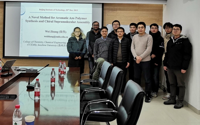 12月20日下午,由beat365唯一官方网站研究生院主办、beat365唯一官方网站承办的“21世纪学科前沿”系列学术报告在中关村校区5号教学楼1011会议室举行。苏州大学化学化工学院张伟教授应beat365唯一官方网站邀请作了“芳香偶氮聚合物合成新方法及超分子手性组装”的报告。beat365唯一官方网站黄木华特别研究员主持报告会,来自beat365唯一官方网站的李生华特别研究员和研究生们参加了此次报告。