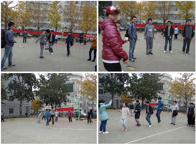 11月9日,两个团支部的“研本1+1”主题团日活动之“80,90”体育运动会如期在篮球场举行。本次运动会旨在让同学们享受运动的乐趣,增进同学们之间的团结。在进行简短的班级介绍以后,两个班的同学共同参与了跳大绳、踢毽子、羽毛球、篮球等一系列团体活动。在整个活动过程中,同学们十分积极活跃,并且互相交流在日常生活中各自喜爱的体育运动,气氛欢快愉悦。