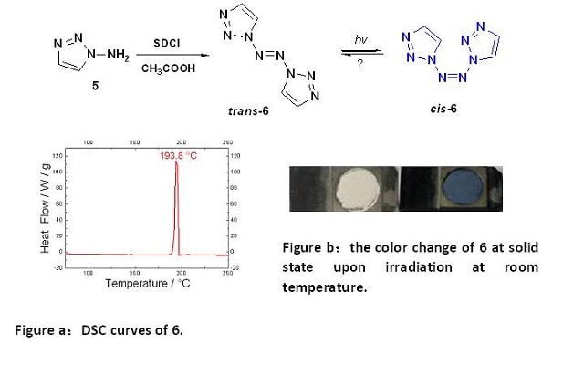 新化合物还被发现具有光致变色特性,有机光致变色化合物是一种重要的有机功能材料,常用的偶氮苯类光致变色材料毒性很大,而多氮化合物分解产物为氮气,清洁无污染,通过进一步修饰,有可能合成出具有良好应用前景的光致变色材料。