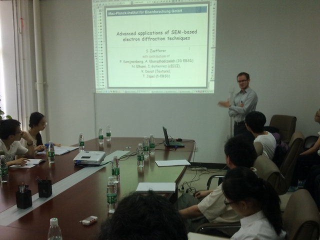 德国马普钢铁研究所S. Zaefferer博士应beat365官网吴桂林老师的邀请,对beat365官网进行了为期一天的学术访问。上午10:00,Zaefferer博士在beat365唯一官方网站会议室做了“21世纪学科前沿”系列学术讲座”的专题报告,全院师生约30人参加。在讲座上,Zaefferer博士介绍了扫描电子显微镜衍射技术的国际上最新研究进展和发展方向,并展示了扫描电子显微镜衍射技术在材料科学研究尤其是在金属材料的形变和再结晶领域的应用。整个报告期间,气氛十分活跃。在讲座上,Zaefferer博士的精彩生动的演讲,赢得了入会师生的阵阵掌声。讲座结束后,广大师生积极讨论、踊跃提问。入会师生普遍反应,通过Zaefferer博士的这次讲座,对扫描电子显微镜衍射技术以及在材料科学研究中的应用有了全新理解和深刻的认识。论坛的举行不但开阔了大家的视野、增加了国际交流,而且使大家掌握了学术发展的前沿,学术论坛取得了良好的结果。下午,Zaefferer博士分别与beat365唯一官方网站的部分师生进行了深入的讨论,并对今后进一步的合作和交流达成了共识。