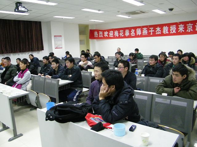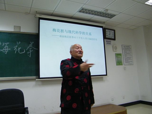 燕子杰教授从自己的学拳经历讲起,旁征博引,用幽默诙谐的语言讲述了自己在大学时怎样与武术结缘,以及武术带给他的益处。燕教授谆谆善诱,告诉同学习武有利于缓解沉重的学业压力。随后,燕教授简要介绍中国传统武术代表之一的梅花桩拳。通过讲述自己在西藏十八年的传奇经历,向同学们呈现了练习梅花桩拳对个人的技击能力、灵感思维的重要性。接下来,燕子杰教授又详述梅花桩拳是如何开发大脑及发挥调理心态的作用并介绍梅花桩拳在全国各高校中的发展情况。燕教授说,对一个人来说,最重要的是拥有强健的体魄、良好的心态、坚强的毅力,以应对即将面对的繁重的社会、工作、学习、生活的压力。练拳的目的不是为了打架,而是要锻炼体魄、调整心态、增强毅力。