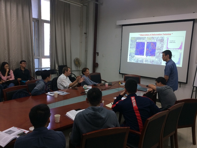 会议由beat365唯一官方网站前沿交叉研究院靳柯副研究员主持。Gerhard Dehm教授首先做了题为“Structure and Nano-/Micromechanics of Materials”的学术报告。Dehm教授主要介绍了通过微纳米尺度的结构控制来优化合金的力学性能,并讲述了运用原子级分辨率透射电子显微镜的一些最新研究结果,如基于多主元概念的高熵合金中的位错诱发塑性机理,fcc金属中位错-晶界的相互作用机制以及晶界相变等。