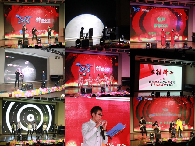 一段极其精彩的B-BOX表演拉开晚会的序幕。汪远莘带来的钢琴独奏River flows in you柔情似水;远道而来的客人,北京化工大学的朋友王虎、李雪健带来相声表演《梦想订单》引得满堂喝彩;姚皓薰带来的声乐表演《那些你很冒险的梦》献给每一个因梦想而勇敢、为梦想而努力的人;有歌有舞才是视听盛宴,北理舞协材女们一袭优雅旗袍带来了热情如火的拉丁表演《You know I'm not good》,婀娜多姿、美不胜收;材料青协萌新的小品节目《抉择》正能量满满;17级硕士四班的同学们带来的舞蹈《Gashina》,火辣的激情,精彩的舞姿,点燃全场气氛;倪志成同学用陶笛演奏经典作品《天空之城》+《森林狂想曲》,仿佛将观众们带到了梦幻国度;BIT underground乐队带来《梦醒时分》和《当穿上军装的那一刻》更是将晚会推向高潮。