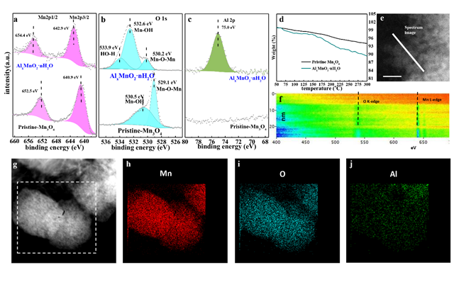 该研究团队设计了一种原位转化电化学反应来使得尖晶石型Mn3O4转化为含水的层状、无定形混合相AlxMnO2·nH2O的目的。为了验证该方法的可行性,采用电子能量损失法(EELS),X射线光电子分析以及透射电子显微镜-能量色散X射线光谱对反应产物的化学状态和元素种类进行了分析与表征。通过分析,电化学转化反应后Mn元素由2价/3价转化为4价。热重分析表明反应产物在50~300℃表现出更明显的质量下降趋势,表明在转化反应过程中结晶水的损失(图1)。通过以上一系列表征分析进一步证明了Mn3O4→AlxMnO2·nH2O原位转化反应的发生。