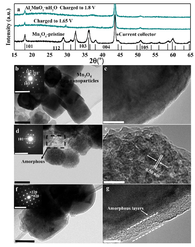 研究者通过X射线衍射和透射电镜更直观的观察了原位转化反应中材料结构的变化,发现原位转化反应过程中,尖晶石相的Mn3O4逐渐无定形化,仅保留了少部分的层状相。在高分辨透射电镜结果中可以看出,与反应前的尖晶石型Mn3O4相比,反应产物AlxMnO2·nH2O具有一层明显的无定形层(图2)。