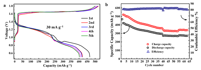 以AlxMnO2·nH2O为正极,金属铝片为负极,Al(OTF)3-H2O为电解液装配水系铝离子电池,发现AlxMnO2·nH2O在1.3V和1.65V分别呈现短的充电平台和长的充电平台,对应于铝离子的脱出反应。首周放电容量高达467mAh g-1加之较高的放电平台电压(平均值达到1.1V)使得该电极材料的能量密度高达481Wh kg-1,在目前的相关研究报道中处于领先。