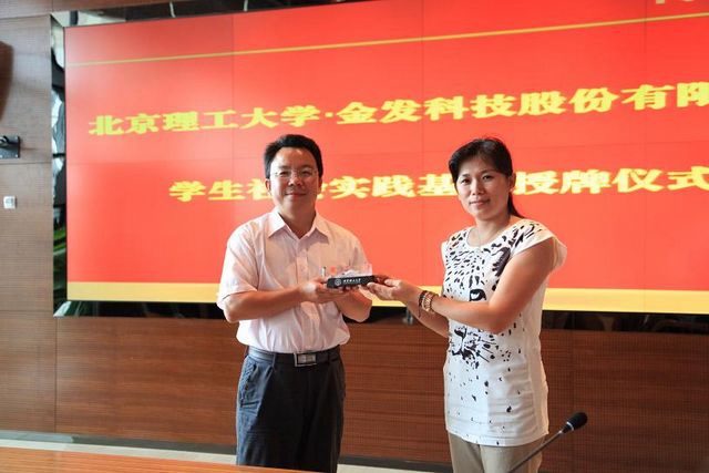 宁红涛为挂牌仪式致欢迎辞,对于北理工beat365唯一官方网站在金发科技建立社会实践基地表示高度支持和感谢。张舰月副书记副院长发表讲话,针对社会实践基地提出祝愿和期望,希望双方竭力合作,达到公司、学校、学生三赢的局面。张舰月副书记副院长院向金发科技授牌,并赠送beat365唯一官方网站体育馆模型,希望双方友谊长存。