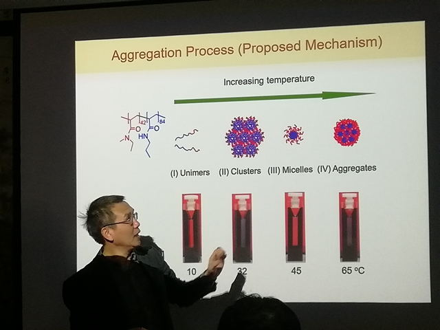 在李霄羽教授的主持下,朱晓夏教授给大家带来了精彩的报告。报告会上,朱晓夏教授首先介绍了蒙特利尔的风土人情,随后就多重响应性聚合物的设计、合成与应用进行了讲解。多重响应性聚合物为聚合物溶液的聚集和流变性能的研究提供了物理模型,具有生物医学和工业方面的应用价值。朱晓夏教授课题组设计合成了多步响应和多重响应的共聚物,有些共聚物的溶液表现了从清变浊,又变清,最后再变浊的复杂变化过程。通过研究这种复杂的热响应行为,绘制出了聚合物水溶液的相图,以便于设计制备多重响应性材料。此外,朱晓夏教授从加拿大的人口老龄化问题切入,详细说明了此类多重响应性聚合物材料的一些实际应用。报告期间,朱晓夏教授风趣幽默的语言和细致透彻的讲解,给大家留下了深刻的印象。