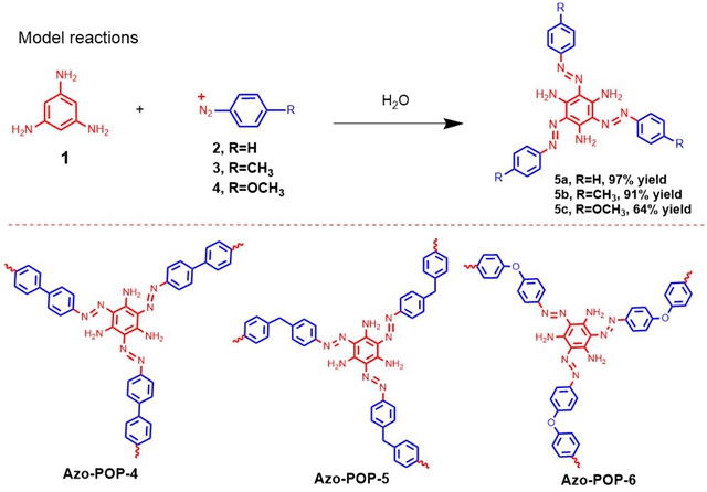 图二 Azo-POP-4、Azo-POP-5和Azo-POP-6的结构及其模型反应