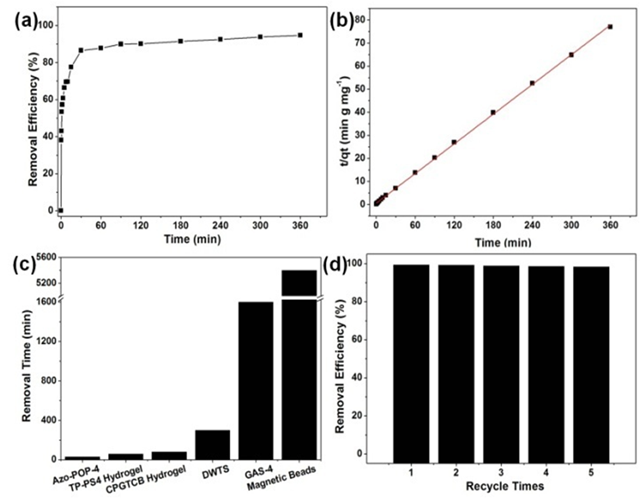 Azo-POP-4~6具有大量的邻氨基-偶氮基团,对水中的铜离子(Cu2+)具有较强的吸附能力。Azo-POP-4能够在30分钟内快速地从水中去除85%的Cu2+,吸附速率快于文献报道的其它吸附剂,循环使用5次仍对Cu2+保持优异的吸附能力(图三)。