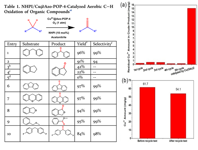 负载Cu2+的有机多孔材料(Cu@Azo-POP-4)被开发为绿色氧化有机化合物C-H键的高效催化剂,将茚满、二苯甲烷、蒽醌等底物中的亚甲基催化氧化为酮羰基。利用核磁共振氢谱(1H-NMR)和气相色谱-质谱联用法(GC-MS)观察到: Cu@Azo-POP-4催化剂对该C-H氧化反应具有化学选择性高和分离产率高等特点(图五-左图)。同时,Cu@Azo-POP-4具有良好的重复使用性和对产物的低污染性。这主要归功于Azo-POP-4的氨基偶氮官能团与Cu2+间存在极强的配位作用,使得Cu2+均匀地被聚合物骨架束缚,以防止其流失(图五-右图)。该工作为进一步发展功能化有机多孔材料的结构设计和应用范围奠定了基础。