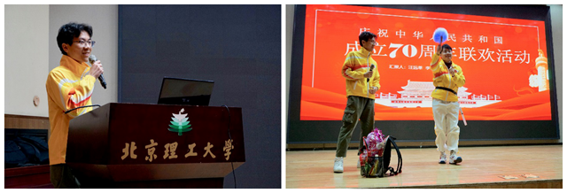 群众联欢方阵代表李宇斯和汪远莘向同学们表现了国庆当天晚上群众联欢的盛大场景,他们风趣幽默地向同学们介绍了表演所用到的所有“高级”道具。通过视频展示,他们讲述了在回民学校训练时的情况,其中党团组织起到了重要团结和组织作用,通过亲身经验鼓励同学发挥志愿精神,不负学校培养和嘱托,做一个对党和国家有用的时代新人。