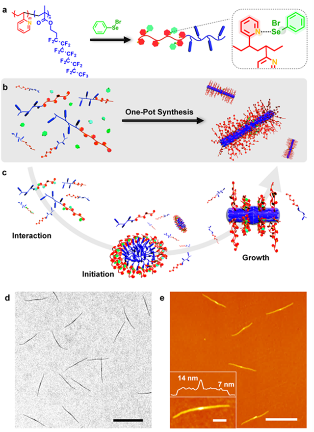 通过高效和通用的方法控制纳米尺度粒子的组装,同时对形貌和尺寸进行精确控制,历来是材料科学及化学领域最吸引人及最具有挑战的研究课题之一。近年来,超分子聚合领域的发展为设计和制备结构复杂、多功能性的人工结构提供了一个有趣的思路。其中,很多纳米结构的合成及制备都是通过“引发-生长”机制(或者称为“种子生长”)来实现的。然而,在大多数情况下,由于超分子相互作用的动态特质,这些基于非共价作用的超分子聚合物纳米结构的稳定性较低,为其尺寸的精确控制和后续功能化带来了难度。