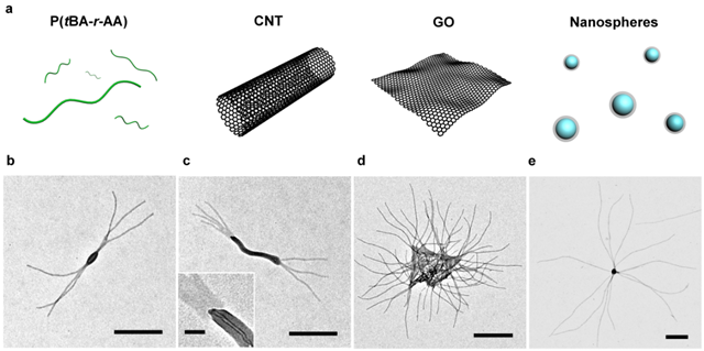 作者进而探索了这些超分子聚合物在加热条件下的解离和降温后重新组装的过程,证明其聚合度完全由组装条件所决定,并可通过调节实验参数使得超分子聚合物在不同长度之间互相转换。此外,作者还研究了多种其他小分子引发剂,它们可分别与聚合物形成氢键,卤键,季铵化物和金属配位键等多种超分子作用。通过简单的加热-降温过程,所有引发剂都可以通过一锅法制备出长度均一的柱状胶束,且引发剂的种类可以显著影响胶束长度。更有趣的是,作者发现不仅可以使用小分子作为引发剂,在使用大分子或纳米颗粒作为引发剂时,可以制备出尺寸可控的分支形、嵌段形、毛刷状或星形多级纳米结构(具有多种拓扑结构的超分子聚合物)。