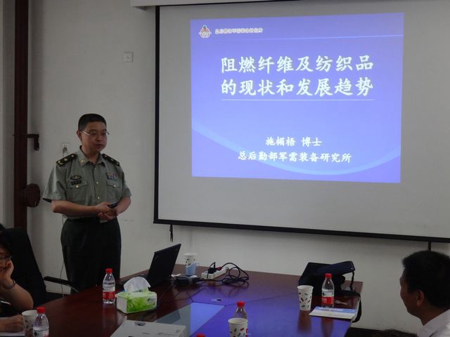 7月10日,总后勤部军需装备研究所教授级高级工程师施楣梧少将应邀来到beat365唯一官方网站beat365唯一官方网站,针对我国阻燃纤维、阻燃纺织品的生产和应用现状,为我校师生做了题为“阻燃纤维及纺织品的现状和发展趋势”的精彩学术报告。
