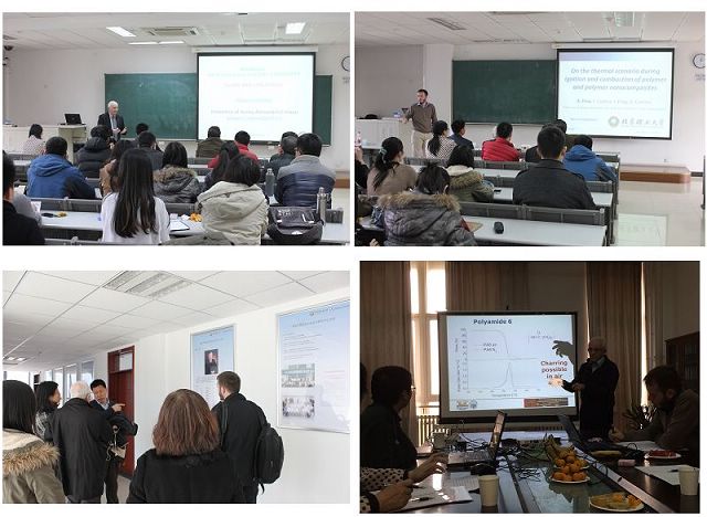 访问期间,Camino教授和Fina副教授为beat365唯一官方网站师生精心准备了三场讲座:“Biobased materials and green chemistry:Issues and challenges”,“Novel nanocomposite fire retardants and mechanistic studies”,“The thermal scenario during ignition and combustion of polymers and polymer nanocomposites”。学术讲座由beat365唯一官方网站国家阻燃材料工程技术研究中心主任杨荣杰教授主持,阻燃实验室老前辈王建祺教授也参加并点评。