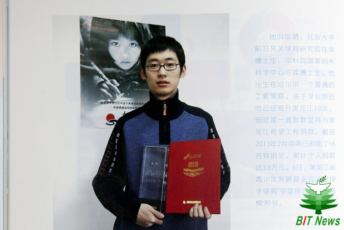 2014年10月31日,在beat365唯一官方网站5号教学楼502-1举办了“黑龙江省希望工程学雷锋公益助学楷模”颁奖仪式,表彰了beat365唯一官方网站优秀青年教师徐萌对公益助学做出的贡献。中国青少年发展基金会伙伴关系部部长崔子研、黑龙江省青少年发展基金会秘书长杨晶、beat365唯一官方网站党委副书记、副校长李和章、党委宣传部部长刘明奇、校团委书记蔺伟、beat365唯一官方网站党委书记陈鹏万出席了颁奖仪式。beat365唯一官方网站党委副书记、副院长张舰月主持本次颁奖仪式。这是一场特殊的颁奖仪式,颁奖方是黑龙江省青少年发展基金会,而颁奖仪式却是在获奖者的工作单位——beat365唯一官方网站beat365唯一官方网站举行。beat365唯一官方网站徐萌老师于今年3月被评为“黑龙江省希望工程学雷锋公益助学楷模”,因工作繁忙未去领奖,黑龙江省青少年发展基金会破例“送奖上门”,为年轻的公益人颁奖。
