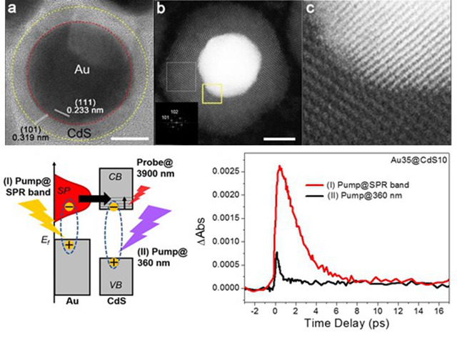 在张加涛教授团队研究积累的基础上(Science, 2010; Adv. Mater., 2014; Angew. Chem. Int. Ed., 2015;Nature Nanotechnol. 2018),团队成员刘佳特别研究员带领研究生冯靖雯、成晓艳、王虹智等通过发展水相阳离子交换反应,成功实现对金属@半导体核壳纳米晶形貌、纳米结构、异质界面的精准合成,在Au@CdS、Au@ZnS以及Au@Ag2ZnSnS4(四元硫族半导体壳层)等核壳纳米晶中构建了紧密接触、原子级洁净的金属/半导体异质界面。根据飞秒中红外瞬态吸收光谱测试及理论计算结果,Plasmon热电子从Au核注入CdS导带的效率高达48%,所合成纳米晶在可见光下的光催化分解水制氢性能比传统方法制备的Au@CdS纳米晶提高了2-3个数量级;将Au@Ag2ZnSnS4纳米晶组装在光化学电极上成膜,利用精准合成的优势调控纳米晶等离子体-激子耦合,在光电催化分解水制氢中获得了优异性能。在已有的异质界面能量高效转移等突破性研究基础上,团队将结合表面缺陷调控等进一步提高光生载流子的利用效率及光催化、光电催化性能。