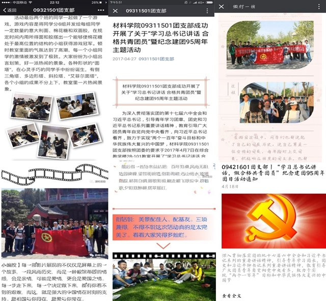 其中09421601团支部组织观看《入团第一课》,共同演唱《光荣啊!共青团》让整个团支部紧紧联系在一起,共同表达共青团员,大学生的青春活力和创造力。09111501团支部则深入学习总书记讲话,学习共青团的建团历史以及讨论如何做合格的共青团员,让团员更加深了对团的了解,明确了自己作为一名合格共青团员团员的义务与责任,在将来的学习与工作中,坚定中华民族复兴的伟大信念,为民族事业贡献自己的力量。09411401团支部举办了研讨沙龙+故事分享,“做合格共青团员”交流会等活动,让团员们将远大理想和正确成长路径结合在一起,将自身发展与中华民族伟大复兴的中国梦结合在一起,努力学习,不断为实现伟大的中国梦而努力。09221301团支部全体团员前往海淀公园观看了海淀公园百姓周末大舞台的表演,在嘹亮的军歌中接受爱国主义教育,同学们在游览中实现了对身体的锻炼,增进了感情,并在交流中提高了对党中央和团中央一些政策的理解。