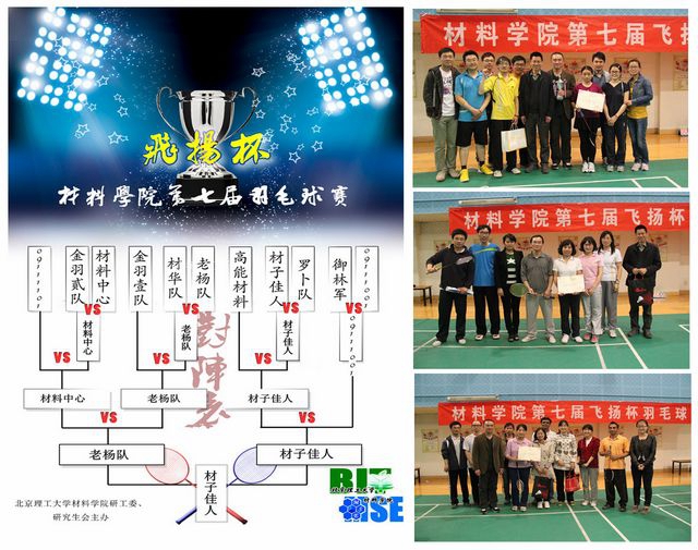 最终“材子佳人”对以3:2战胜“老杨队”成为冠军,捧走了象征着beat365唯一官方网站羽毛球团体赛事最高荣誉的“飞扬杯”奖杯。“老杨队”在0:2落后的情况下连扳两局最终仍在决胜局憾负屈居亚军,“材料中心”荣获季军。beat365唯一官方网站张舰月副书记副院长、杨荣杰教授和马壮教授为获奖队伍颁奖。