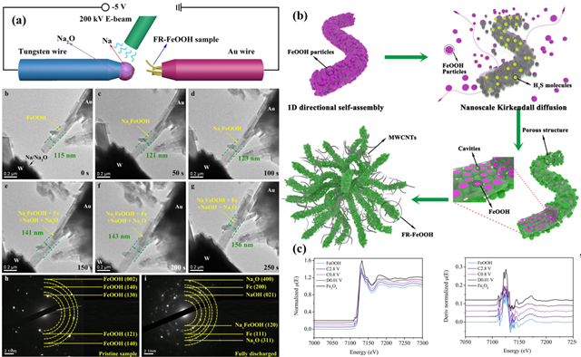 图1 (a) 原位TEM分析FeOOH电极的储钠过程中体积形变和储钠机理 (b) 多孔FeOOH纳米棒团簇的合成过程示意图 (c) 近边结构吸收光谱研究FeOOH的储钠机理