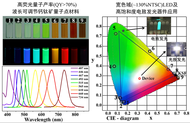 针对显示应用需求,自2013年开始在国际上率先开展了有机无机杂化钙钛矿量子点材料的研究,与董宇平教授等人合作,发现了钙钛矿材料的聚集诱导荧光特性( Adv. Opt. Mater. 2015, 3, 112 该期刊2014.07-2015.07阅读最多的10篇论文之一);利用该特性,建立了室温再沉淀和微乳液制备钙钛矿量子点技术(国际专利申请:PCT/CN2015/092497),获得了颜色可调、发光效率高的钙钛矿量子点材料(见图2),与华中科技大学韩俊波教授合作,阐明了尺寸减小和有效包覆提高量子点荧光量子产率的物理机制,在此基础上,展示了高显色性的宽色域白光LED原型器件(~130% NTSC标准,重合度~96%, ACS Nano 2015, 9 4533,ESI高被引论文,被Materials View China网站和《科学通报》英文版作为亮点报道);与加州大学洛杉矶分校(UCLA)的裴启兵教授小组合作,实现了高效率的绿光电致发光LED器件,为钙钛矿材料的电致发光显示提供了新技术路线( ACS Appl. Mater. Interface 2015, 7, 28128,该期刊当月阅读最多的20篇论文之一)。