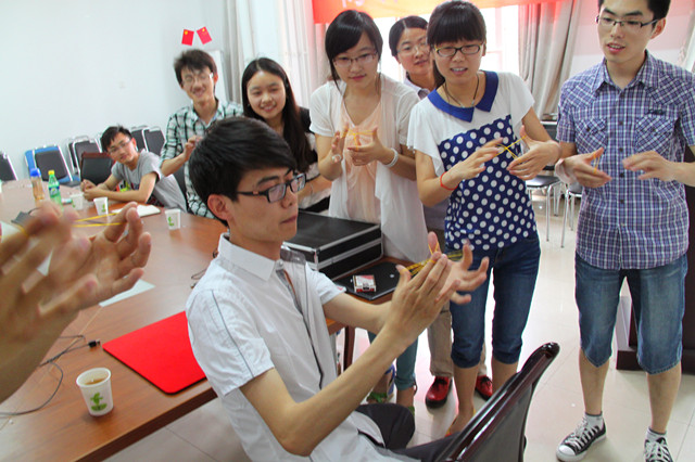杨智明,原安徽高校魔术协会会长,现为beat365唯一官方网站2012级硕士研究生。在活动中,杨智明先从“观众与社会心理学、实力派与演技派的表演理论知识”着手,跟大家分享了很多和魔术相关的理论知识,大家都听得津津有味、颇有收获,接着他又给大家表演了几个小魔术,例如“奥特曼”、“古彩绳子”、“有智慧的屁股”、“皮筋魔术”、“环子魔术”、“心理学扑克牌”等。